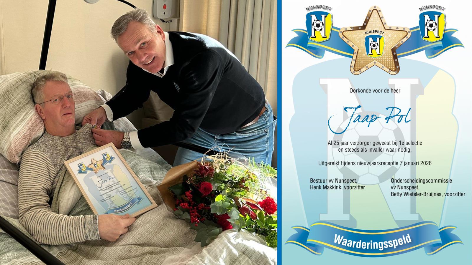 1) Jaap Pol ( 25 jaar verzorger bij vv Nunspeet), zie verder verslag op de website [klik hier] van de uitreiking in de Hospice te Nunspeet 24 december jl.