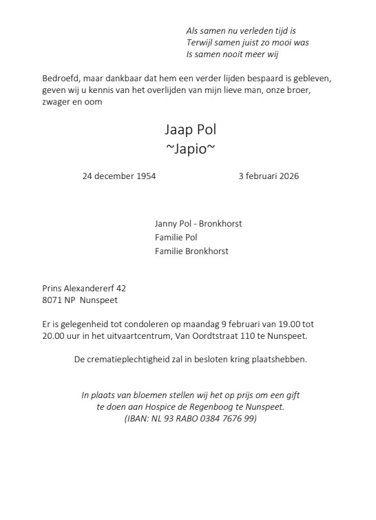 Bestuur en leden voetbalvereniging Nunspeet zijn verdrietig, dat na een kort ziekbed op 3 februari 2026 is overleden ons lid