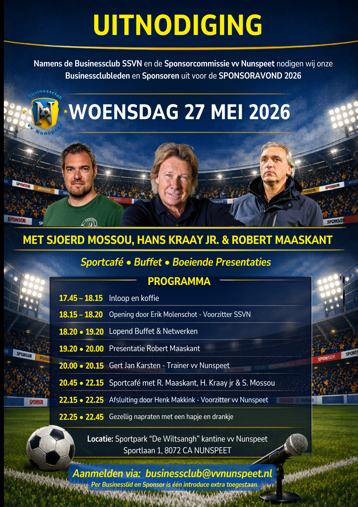 Heeft u zich nog niet aangemeld, deze avond hebben wij het onderstaande programma voor onze sponsoren en businessleden. Neem een introducé mee. Aanmelden kan via businessclub@vvnunspeet.nl